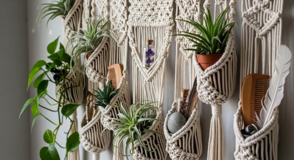 Macramé pocket organizers are perfect for small items or even mini potted plants. The handcrafted knots provide texture and style while keeping essentials off surfaces.