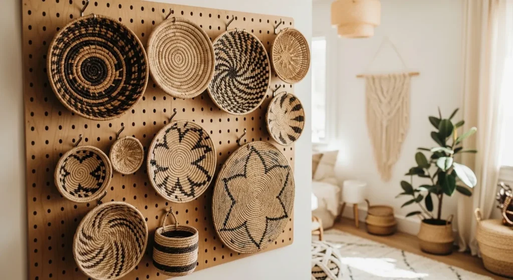 Use a mix of basket sizes and colors for an eclectic bohemian display. This system is practical, easy to rearrange, and creates a visually dynamic Pinterest-friendly wall.
