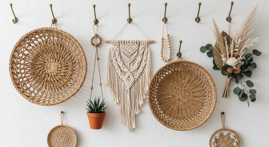 Arrange baskets asymmetrically for a casual, layered look. Mix with wooden or macramé elements to enhance bohemian style. This solution keeps walls organized while staying decorative and Pinterest-worthy.