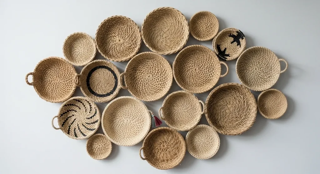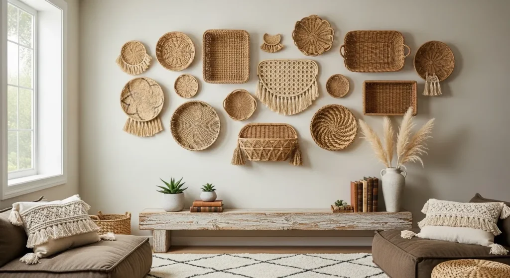 Arranging multiple small woven baskets in clusters creates a gallery-like wall of functional decor. Use baskets to hold keys, plants, or small items while adding boho charm and dimension to walls.
