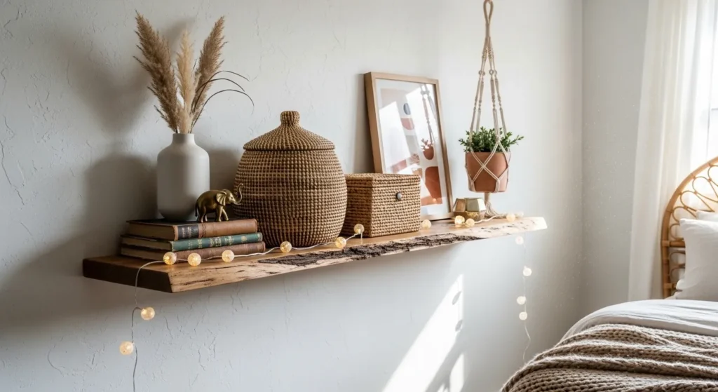 Hang at eye level or stagger multiple shelves for a layered wall display. This mix of shelf and basket adds functionality, charm, and a bohemian vibe perfect for Pinterest inspiration.