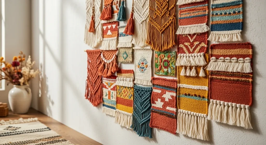 Layering small textile pieces on the wall adds softness and artistic personality. Instead of using one large tapestry, combining two or three smaller woven pieces creates depth and visual texture.