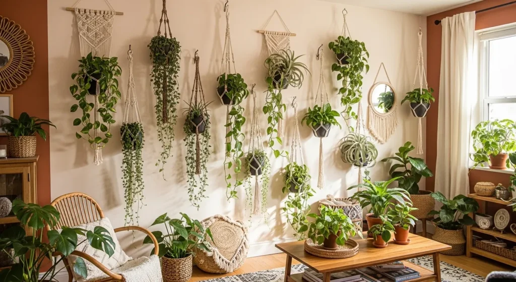 Plants are essential in boho decor, and hanging them vertically is perfect for small spaces. Macrame plant hangers or wall-mounted planters allow greenery to climb upward rather than spread across surfaces.