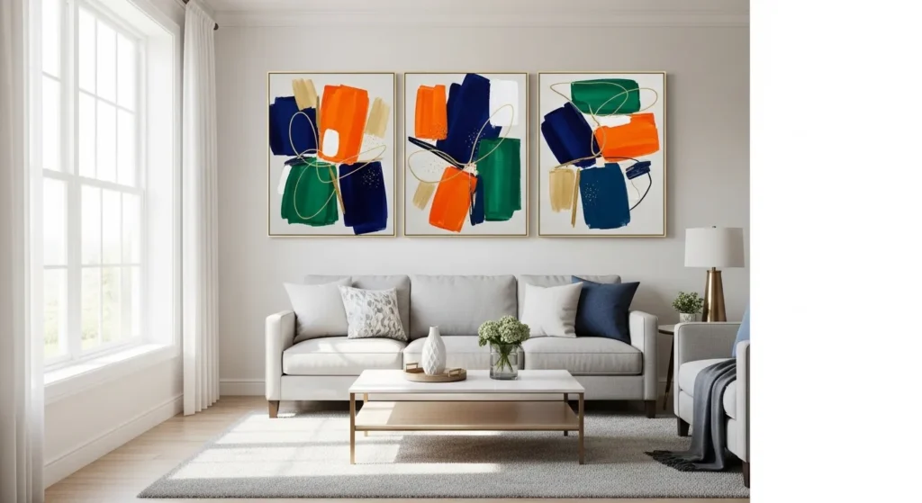 A triptych divides one bold design into three coordinated panels, creating movement and balance at the same time. This format feels modern and impactful while distributing color evenly across the wall.