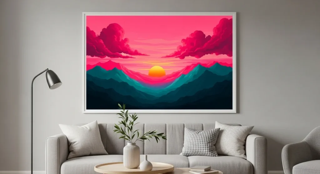 Landscape prints in amplified color palettes feel fresh and dramatic. Instead of muted natural tones, opt for bright skies, bold oceans, or stylized mountains in saturated hues. The result feels artistic rather than traditional.