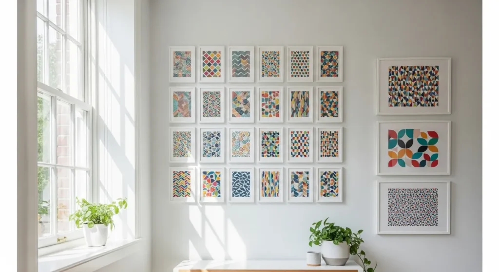 A grid layout of smaller colorful prints creates organized energy. Each frame can feature a different bold pattern, but the uniform alignment keeps everything visually controlled.