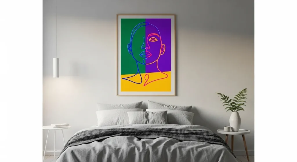 Place one oversized print above the bed or sofa for maximum effect. Allow generous negative space around it to avoid overcrowding. The balance between minimal line work and vibrant tone keeps the space energized yet refined.