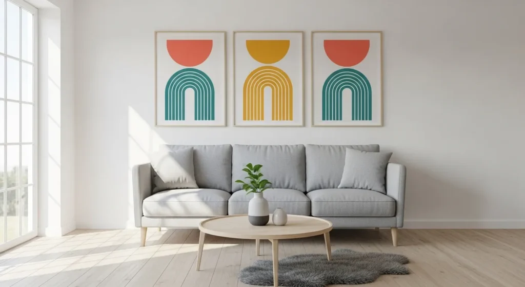For best results, choose a palette that complements your furniture. Three coordinated geometric prints arranged evenly above a sofa can energize the space without cluttering it. The simplicity of the shapes keeps the look intentional and sharp.