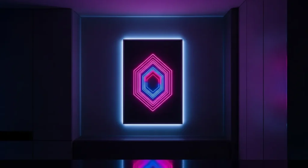 Use this style sparingly. One central neon-inspired print above a console or desk is enough to energize the room. Keep surrounding decor minimal to prevent visual competition.