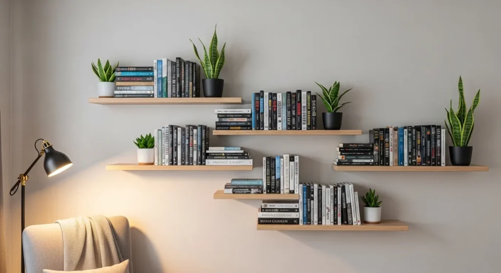 A wall-mounted book rack showcases your current reads while saving floor space. Vertical or angled designs add movement to the wall and make books easily accessible.