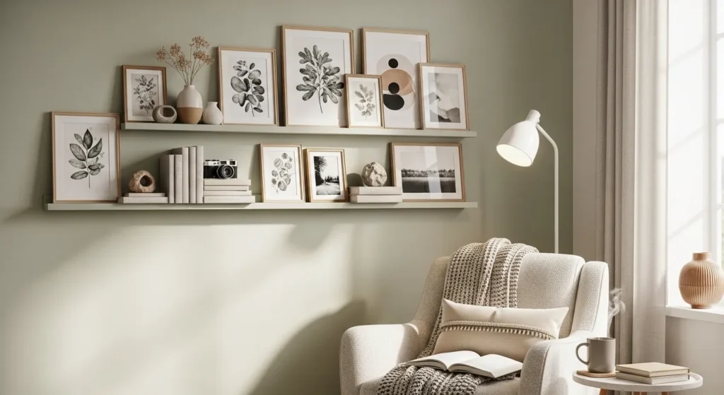 A picture ledge allows you to lean multiple frames and objects against the wall without committing to permanent placement. This layered approach creates depth, texture, and a curated feel in your nook.