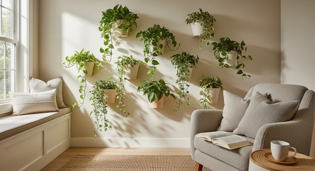Floating wall planters introduce natural elements that energize and calm the nook. Trailing greenery adds vertical interest and creates a serene, peaceful atmosphere perfect for reading.