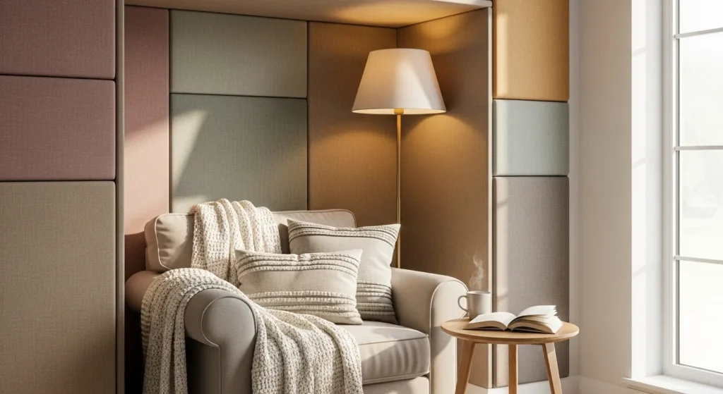 Fabric panels add texture, softness, and warmth to a reading nook wall. They reduce harsh lines, create acoustic benefits, and give the space a snug, inviting atmosphere.