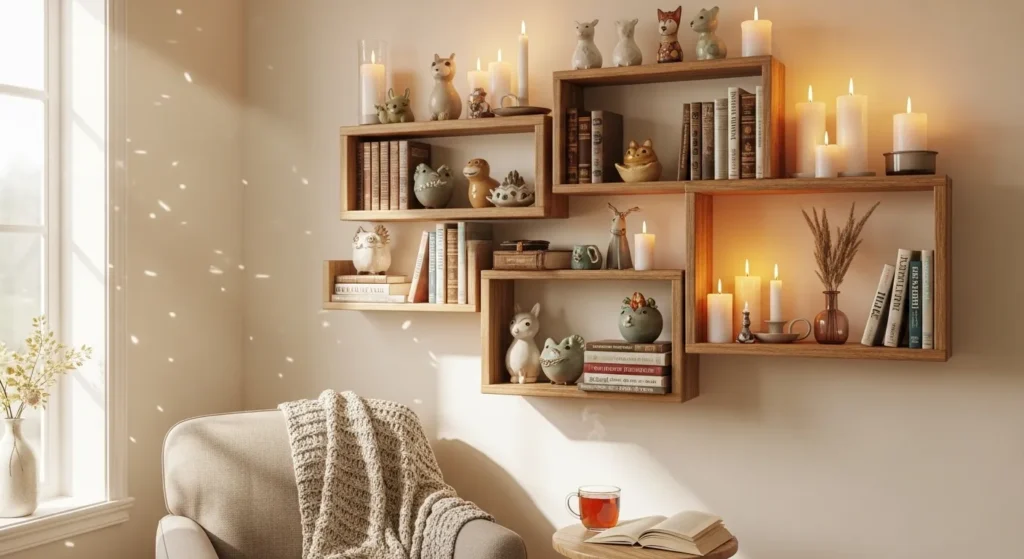 Small wall-mounted shelves are perfect for displaying cherished items without cluttering the floor. Candles, figurines, or mini sculptures add personality and make the wall visually dynamic.