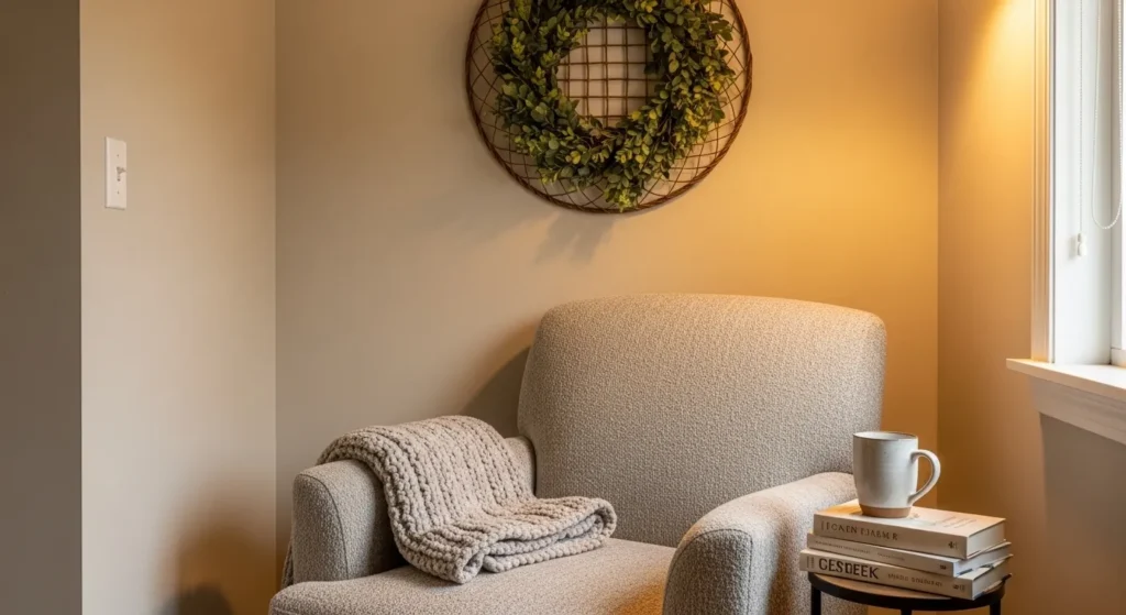 A wreath or circular piece introduces softness and balance to the wall. It adds a welcoming, organic feel that draws the eye and anchors the reading area.