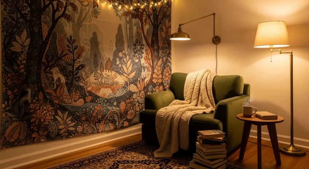 A tapestry or wall mural transforms the nook into a true statement space. It adds color, pattern, and visual depth, creating an immersive reading environment.