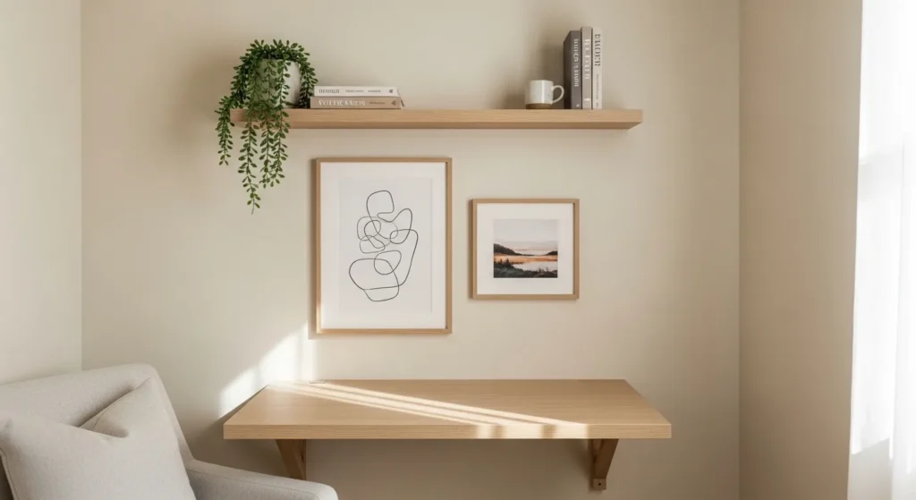 Integrating a small floating desk into your reading nook allows functionality without taking up floor space. Pair it with minimal wall decor to maintain balance and inspiration.
