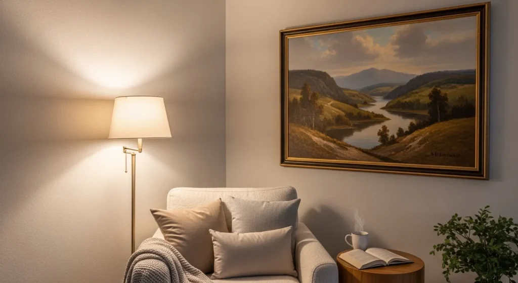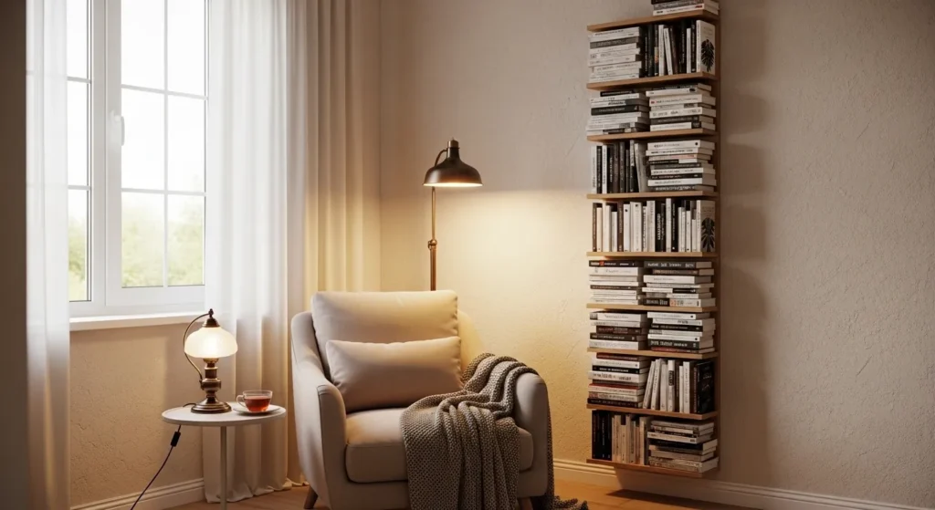 Place it next to the chair or within arm’s reach. Coordinating with small decorative elements or art keeps the wall feeling curated, layered, and perfectly cozy for a reading session.