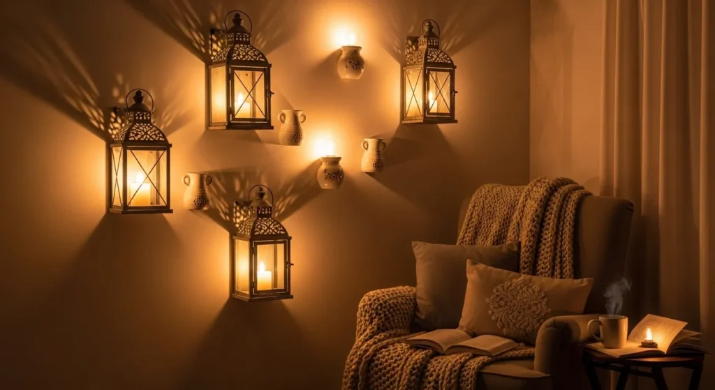 Wall-mounted lanterns or candle holders provide soft, warm lighting that enhances the cozy atmosphere. They also act as decorative elements, adding charm and texture to the wall.