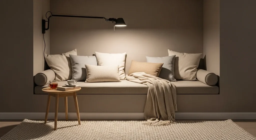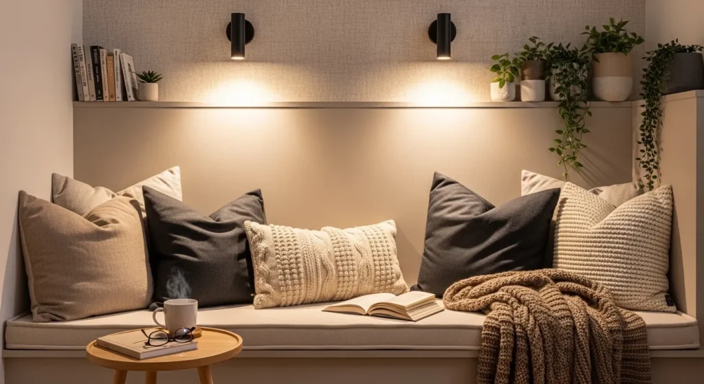 Sconces provide ambient lighting and a decorative element to your nook. Warm light enhances comfort, making it perfect for evening reading or creating a calming atmosphere.