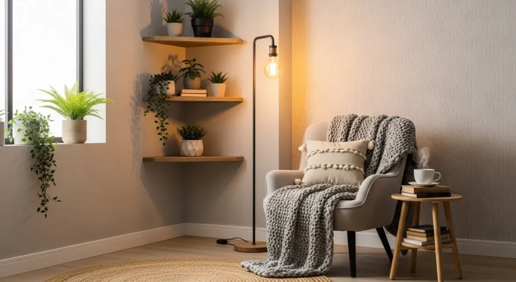 Corner shelves add dimension and greenery without taking up floor space. Small plants bring life and freshness to the nook, softening the surrounding walls and creating a calming atmosphere.