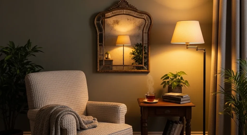 Mirrors reflect light and add depth, making a small nook feel larger and brighter. A vintage or ornate design adds character while enhancing the cozy aesthetic.