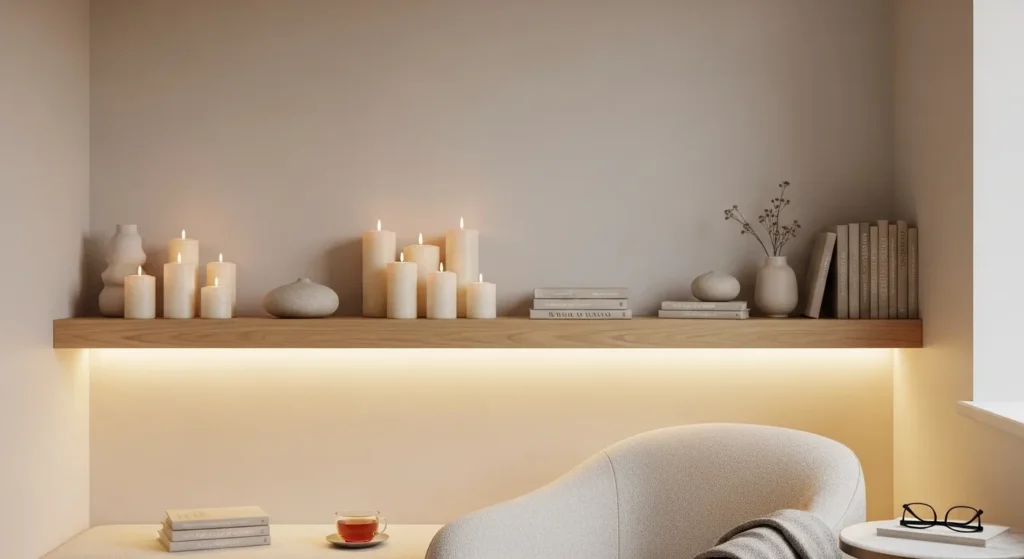 A floating shelf can display candles, small decor, or favorite trinkets. This adds both warmth and personality to the nook, creating an ambient, layered wall feature.