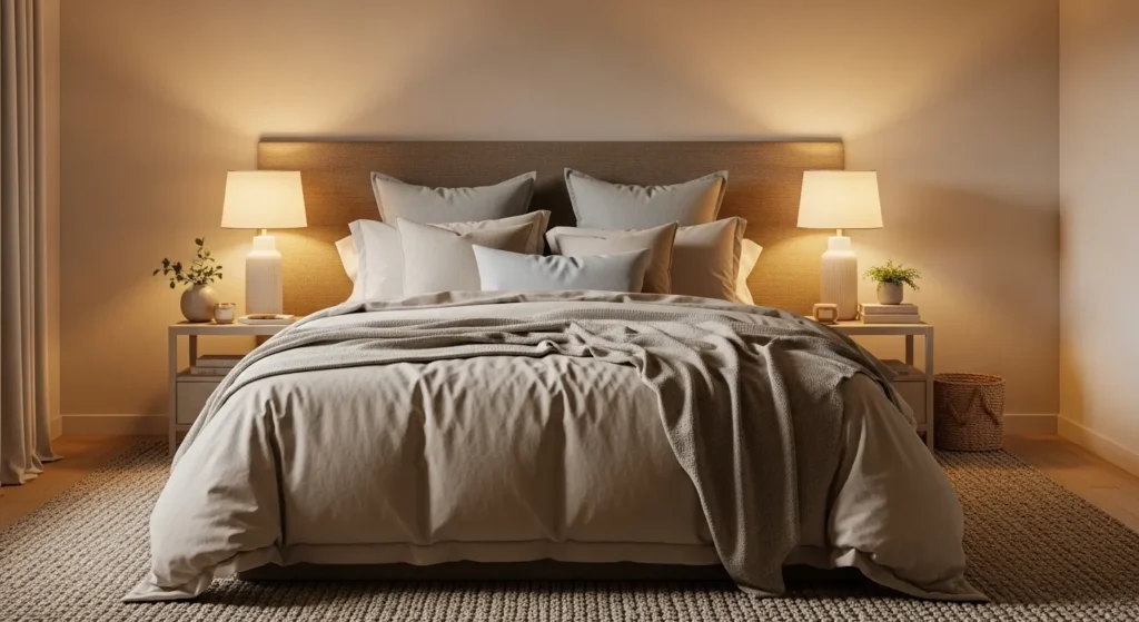 Lighting plays a major role in how beige tones appear in a bedroom. Warm lighting enhances the softness of the color palette and creates a comfortable, inviting atmosphere. Bedside lamps, wall sconces, or layered lighting sources can help achieve this effect.