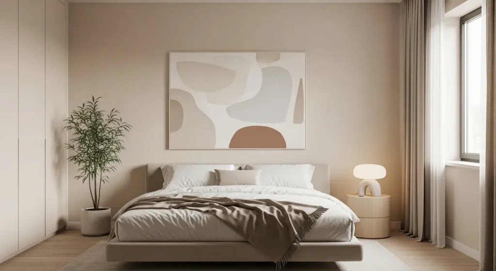 Abstract wall art in neutral shades is a great way to add personality without disrupting the calm palette. Look for artwork that includes beige, cream, taupe, or soft brown tones. These subtle colors blend seamlessly with the room while still adding visual interest.