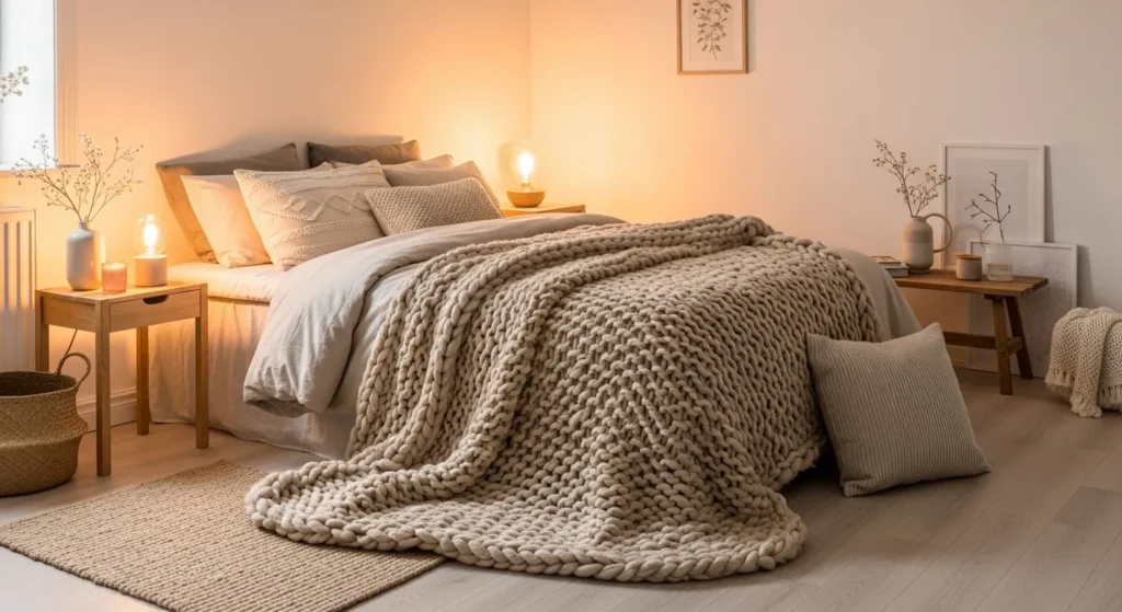 This layered approach works particularly well in neutral bedrooms where texture becomes the main design feature. Chunky knit blankets, soft duvets, and plush pillows create a bed that feels comfortable and welcoming. The result is a bedroom centerpiece that instantly makes the entire room look elegant while maintaining a calm and relaxing atmosphere.