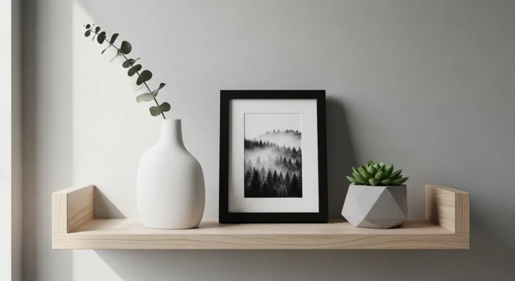 Scale is critical for small wall styling. Oversized items can overpower narrow shelves, while tiny decor can disappear visually.