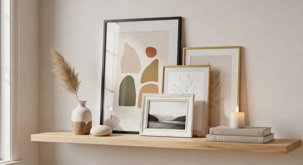 Layered art gives your shelf a curated, collected look. It feels relaxed yet intentional. This approach works especially well in living rooms or home offices where personality matters. By stacking frames gently and mixing sizes, you create a visually rich display without overwhelming the limited wall space.