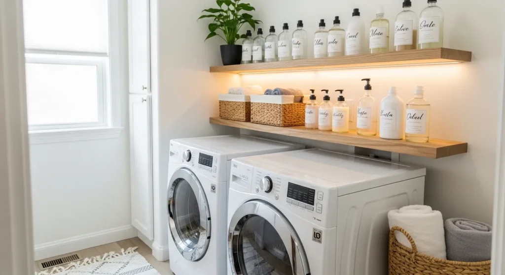 Use matching baskets or containers for a tidy, cohesive look. Floating shelves create a functional and stylish wall that keeps your laundry essentials organized while maximizing every inch of space.