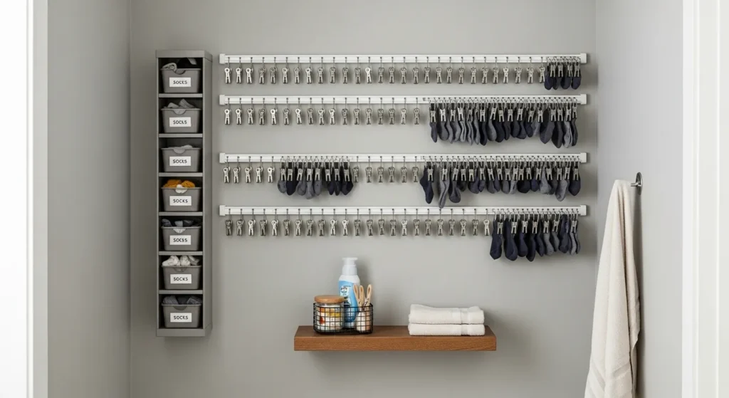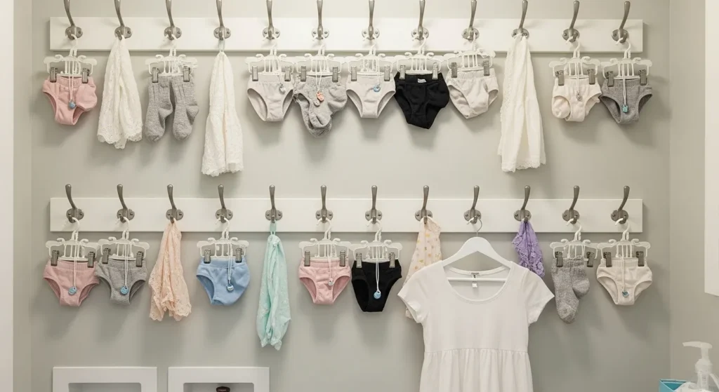 Wall-mounted drying clips make air-drying small items simple and space-efficient. They keep socks, underwear, and delicates off counters or shelves while maximizing vertical space.