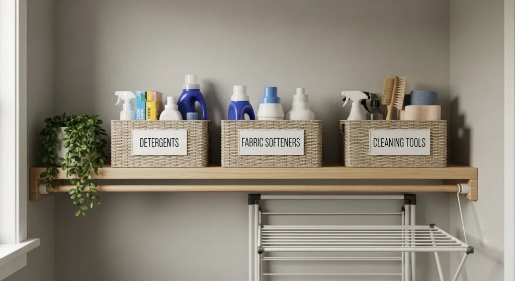 Use labeled or color-coded bins for easy identification. Combine with hooks or a hanging rod below for multi-functional storage. This simple setup keeps your laundry room stylish and highly functional.
