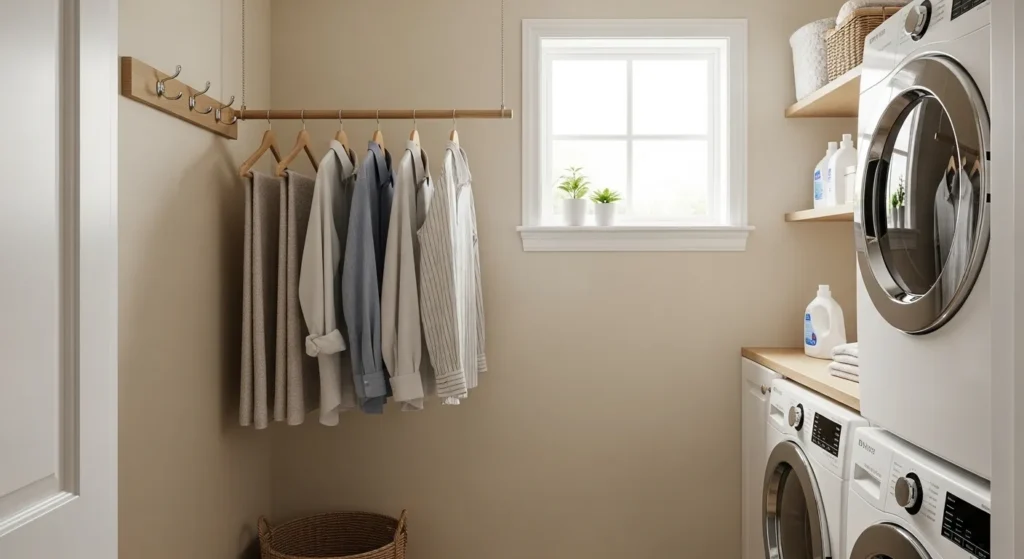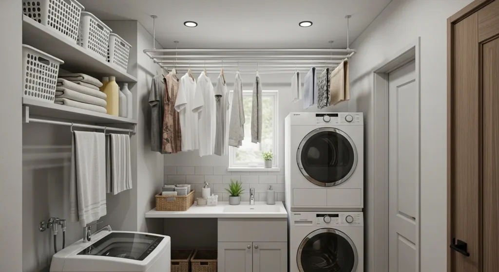 An overhead ceiling rack provides extra drying space without taking up any floor area. Ideal for apartments or small laundry rooms, it keeps clothes organized and off countertops.