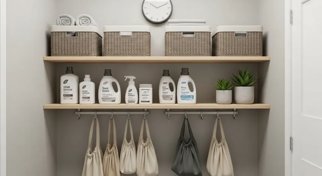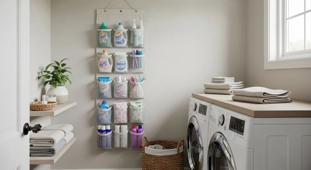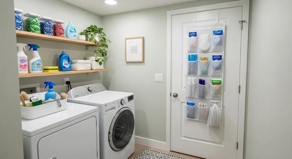 Over-the-door storage makes use of often-overlooked space behind doors. It’s ideal for detergents, cleaning sprays, or laundry bags, keeping them accessible yet out of the way.