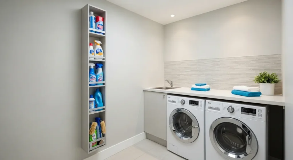 A tall, narrow cabinet maximizes vertical space in compact laundry rooms. Store detergents, cleaning products, and extra supplies neatly while keeping the floor clear.