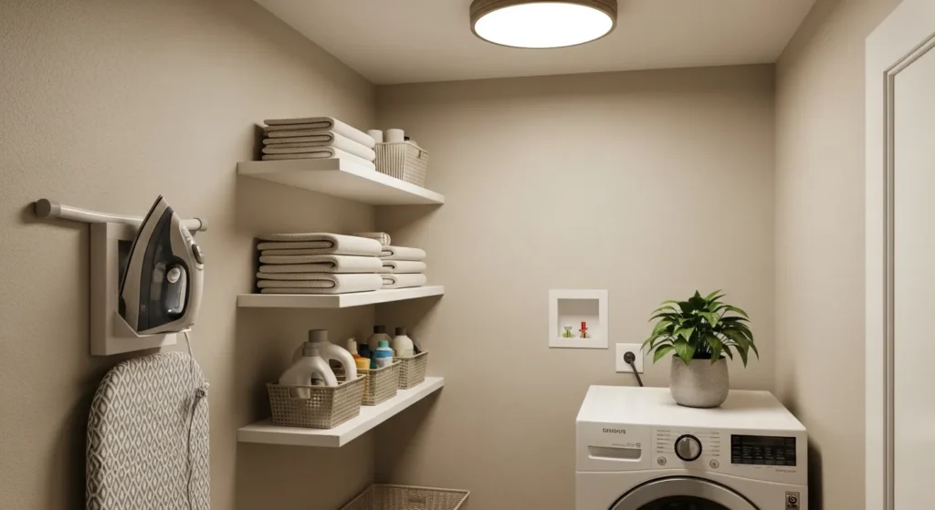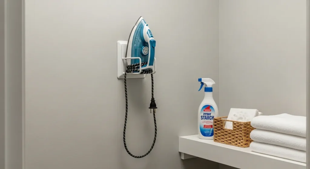 Pair with a small hook or shelf nearby to store spray bottles or iron accessories. This setup keeps everything you need for laundry within reach without cluttering the room.