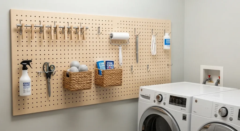 Pegboards with hooks for clothespins allow small items to be stored neatly and within reach. This is ideal for keeping the laundry process organized and efficient.
