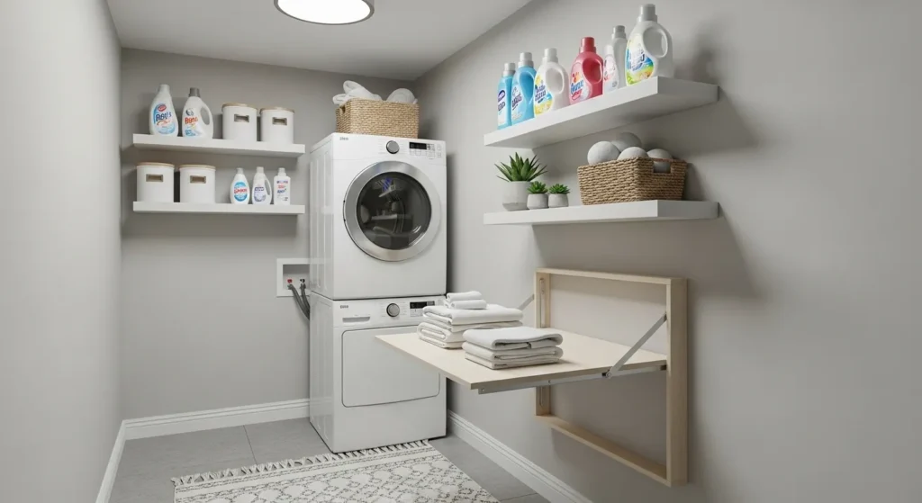 A foldable wall-mounted table provides a workspace for folding or sorting clothes without occupying permanent floor space. It can be tucked away when not in use.