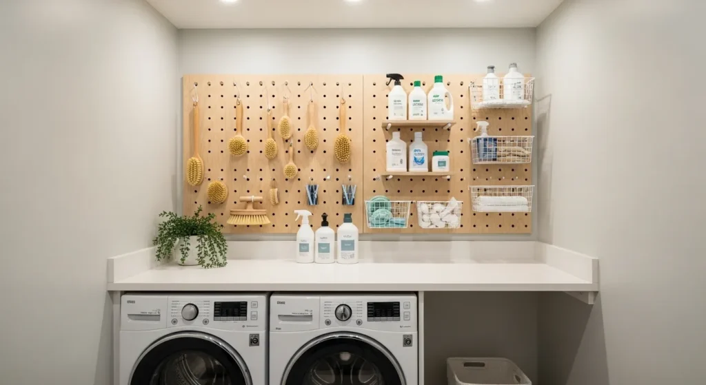 Arrange items by function or size for a visually appealing display. Paint the pegboard a complementary color to your walls to enhance the decor while keeping laundry essentials within reach.