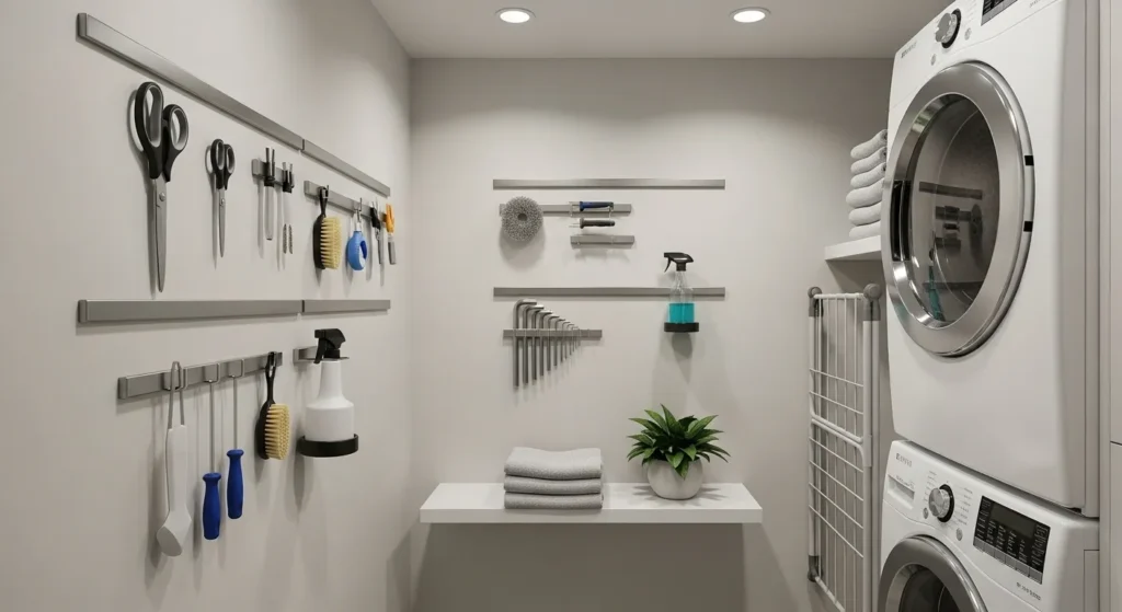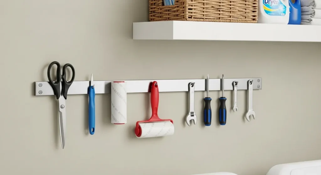 Magnetic strips keep small metal tools like scissors or lint rollers within reach but off counters. This reduces clutter and makes items easy to find.