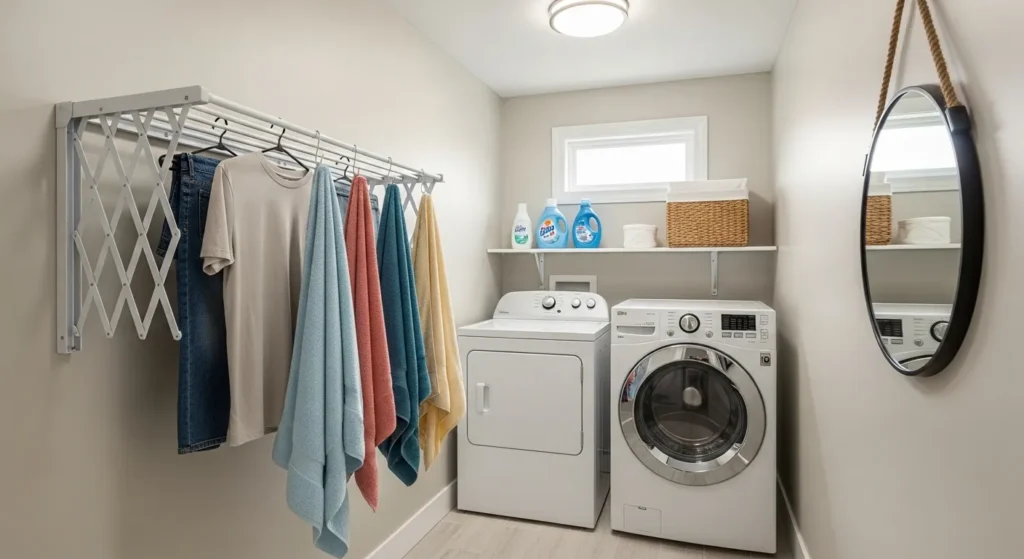 A wall-mounted drying rack provides extra drying space without taking up floor area. It’s perfect for delicate items or when the weather doesn’t allow outdoor drying.