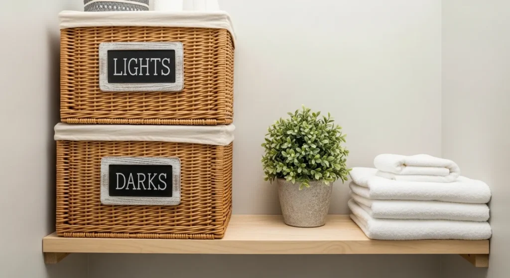 Use uniform baskets for a cohesive look, and label each basket for convenience. This method keeps the laundry process organized, efficient, and visually pleasing, especially in compact spaces.