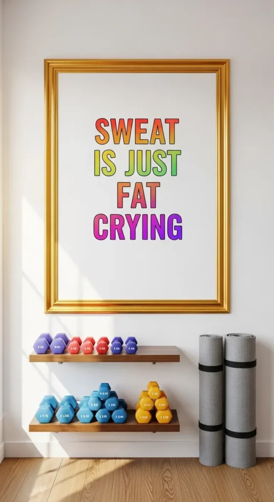 Frame your favorite phrases in bold, bright colors to catch the eye while working out. Position them at eye level where they’re easily visible from cardio equipment, yoga mats, or weight stations. The repeated visual reinforcement helps establish a positive, driven mindset.