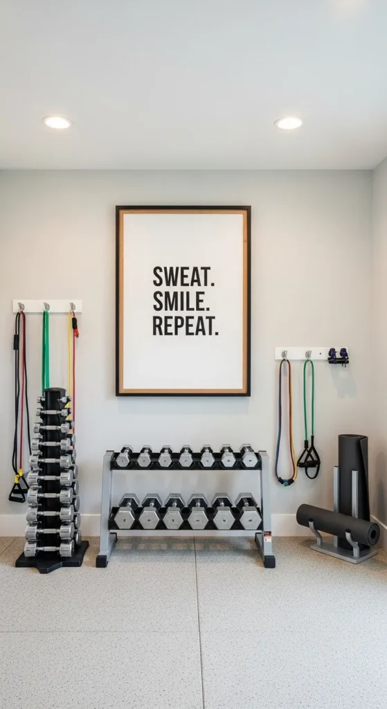 Functional wall decor like a weight rack keeps equipment organized while serving as a visual reminder to exercise. Displaying weights neatly encourages consistency and helps maintain a tidy, motivating environment.