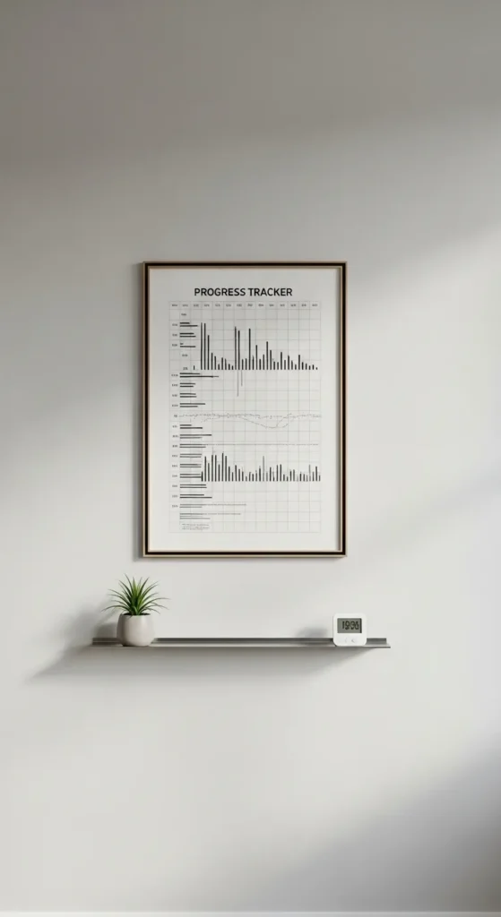 A wall-mounted progress tracker combines decor and accountability. Charting personal fitness goals like weight lifted, miles run, or workout streaks keeps motivation high while visually celebrating achievements.