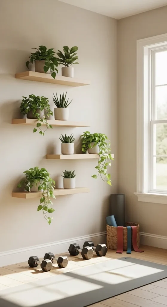 Adding greenery with floating shelves softens the energy of a home gym. Small potted plants or succulents improve air quality and bring a sense of calm while maintaining an energetic vibe.
