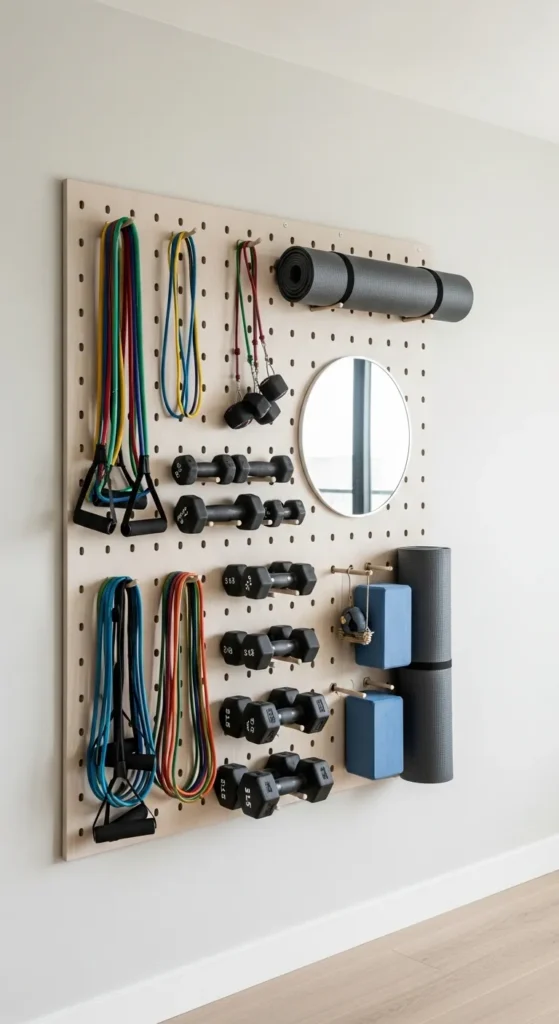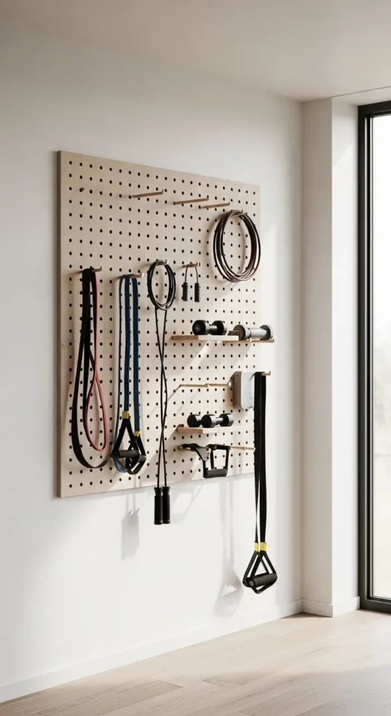A pegboard wall provides versatile storage and decor simultaneously. Hanging equipment visually organizes your space and keeps everything accessible, reducing clutter and encouraging regular use.
